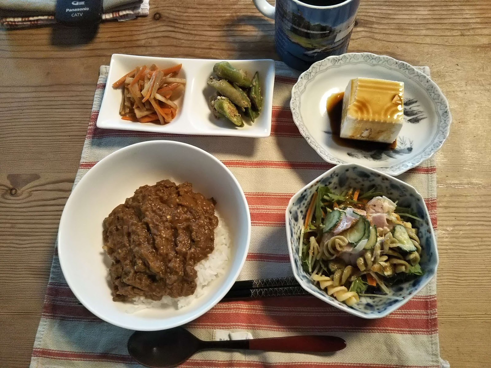※写真は先日の夕食で、自家製ドライカレー・マカロニサラダ・冷奴等です。